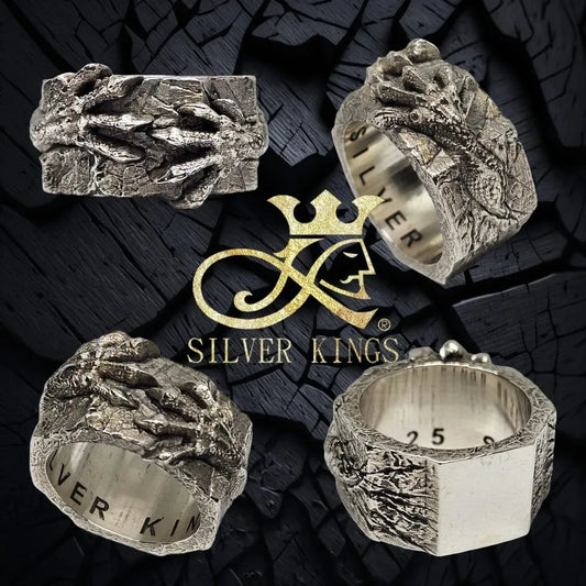 SILVER KINGS has once again created a new piece using dragon elements after 12 years. This ring combines the elements of a dragon and wings, infused with the imagery of "the hidden dragon does not act." The dragon symbolizes strength, authority, wisdom, and divinity, and is also regarded as a guardian and protector, representing courage and protection. Wings symbolize soaring and freedom, representing the ability to pursue dreams, transcend limits, and explore the unknown. The phrase "the hidden dragon does not act" signifies the unwavering energy reserve, indicating that even if the dragon sinks its claws into its own wings, it vows to retain its strength until the last moment to unleash its maximum potential.
