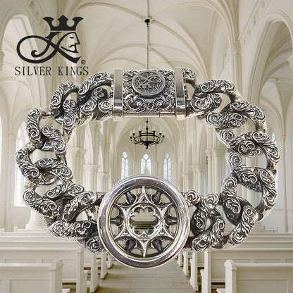 Design a Bracelet in the Gothic architectural style, using intricate patterns and designs inspired by church window frames to add a sense of modern mystique.