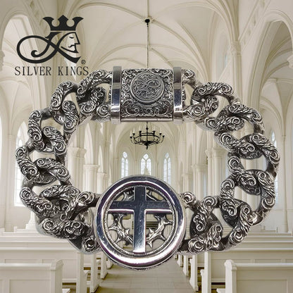 Design a bracelet in the Gothic architectural style, using intricate patterns and designs inspired by church window frames to add a sense of modern mystique.