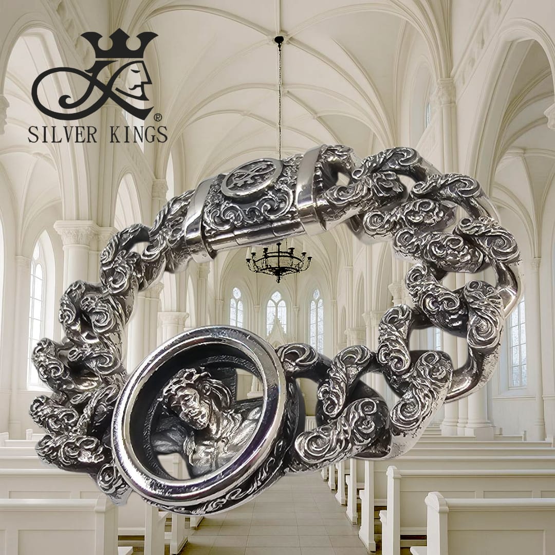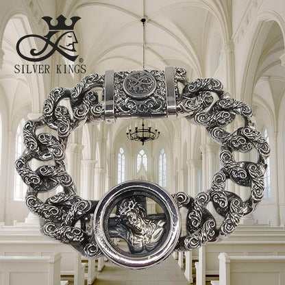 Design a bracelet in the Gothic architectural style, using intricate patterns and designs inspired by church window frames to add a sense of modern mystique.
